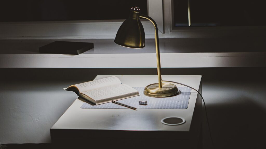 デスクライト+間接照明の併用で、影のコントラストを弱めると注意が散りにくくなる。